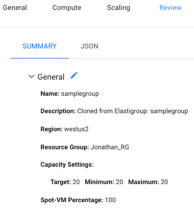 If you would like to modify the configuration before creating the new Elastigroup, just click on one of the tabs above (e.g., General, Compute or Scaling) or on one of the Edit icons in the Review page. Alternatively, you can click on the JSON tab and make your modifications in the JSON view of the configuration.