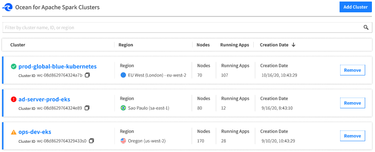 Ocean for Apache Spark (also referred to as Ocean Spark) enables you to see an overview of all your Ocean Spark clusters, get status at a glance, perform tasks such as adding and removing clusters, and drill down to more detailed cluster information when you need to.