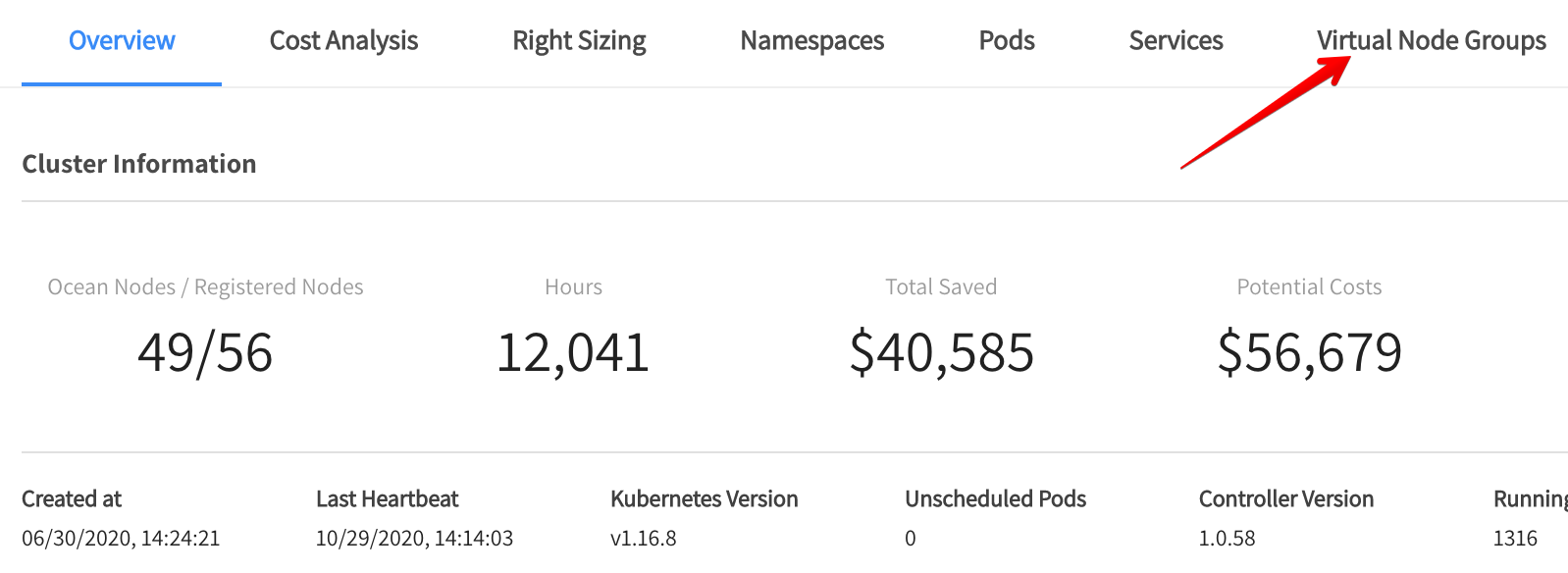 Click the Virtual Node Groups tab. The Virtual Node Groups tab opens and displays a summary of all the VNGs defined in the Ocean cluster.
