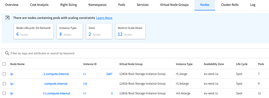 In addition to the overall summary in the summary line, the table provides summary information per node. In the Pods column, an arrow indicates that one or more pods in that node have scaling constraints. Click on the arrow to see a popup constraint summary for that node.