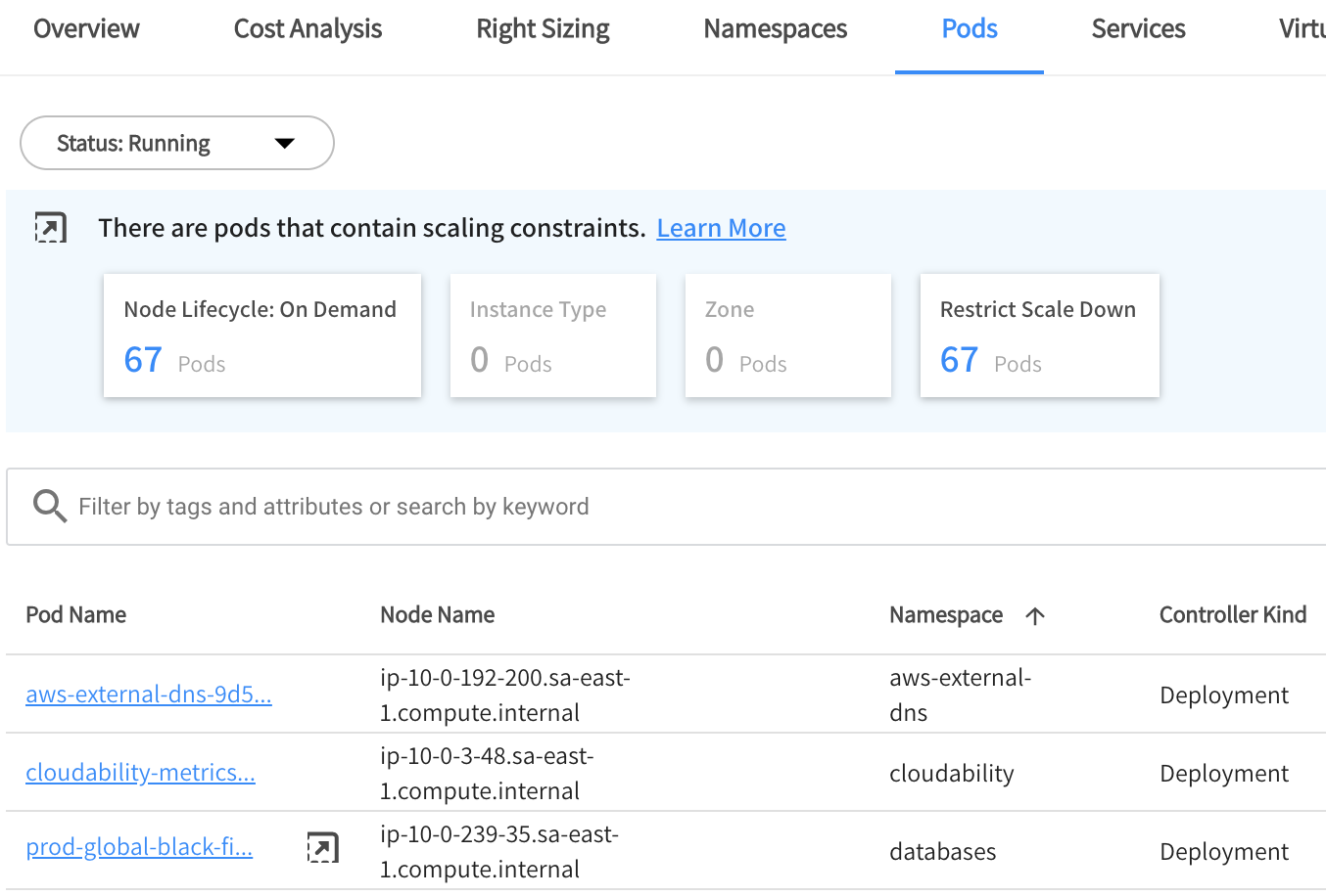 • When the Pods tab opens, a banner at the top indicates if there are constraints on the pods.